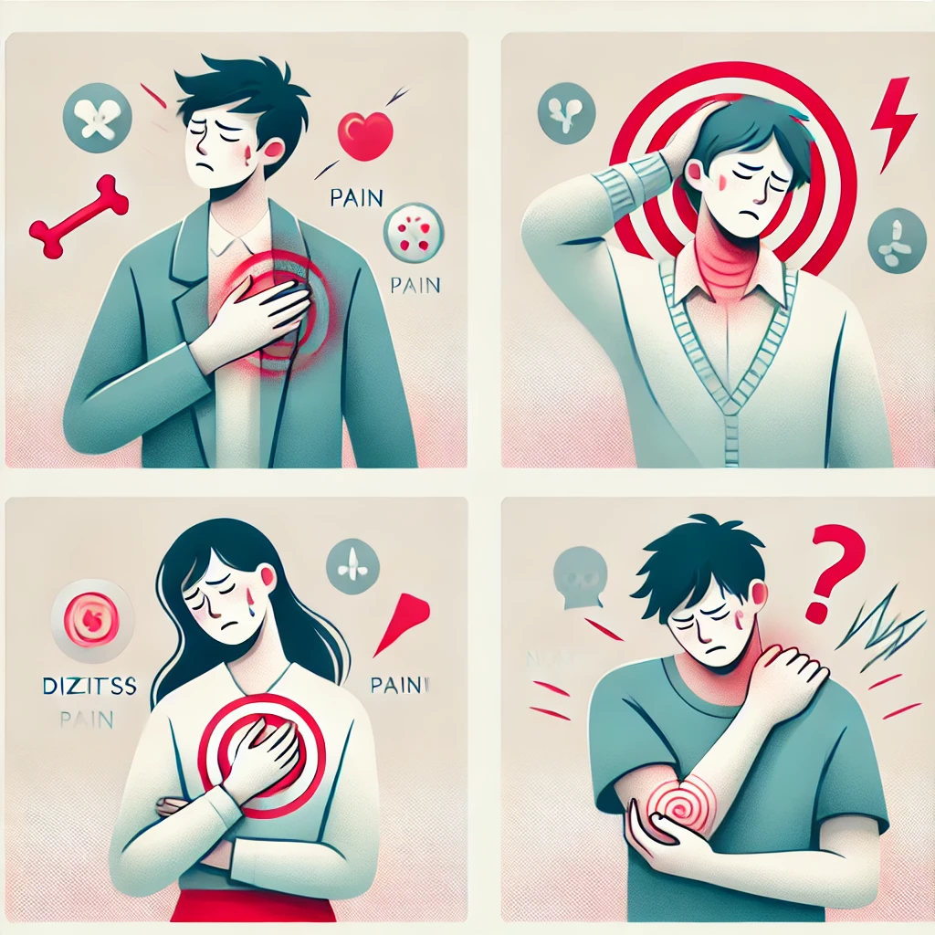 • 가슴 통증: 가슴 중앙에 압박감이나 짜릿한 통증이 느껴짐. 이 통증은 팔, 어깨, 목, 등, 턱 등으로 퍼질 수 있어.
